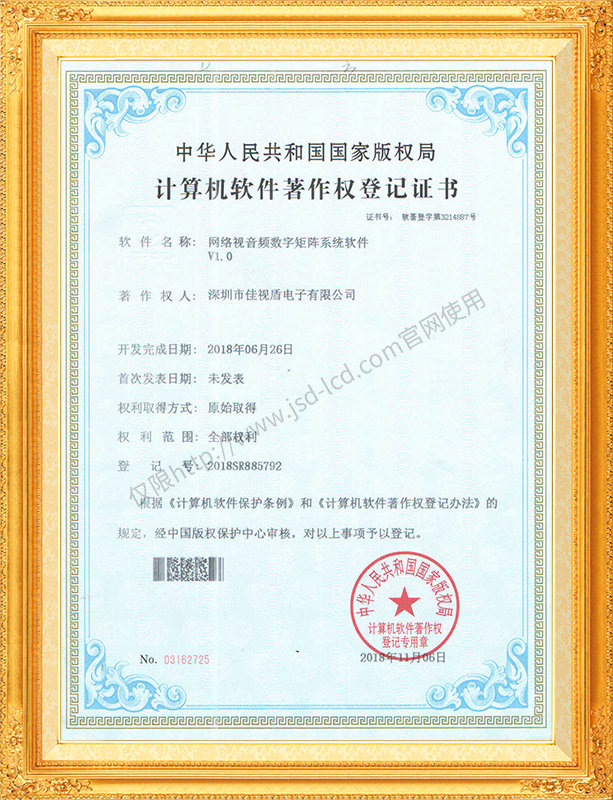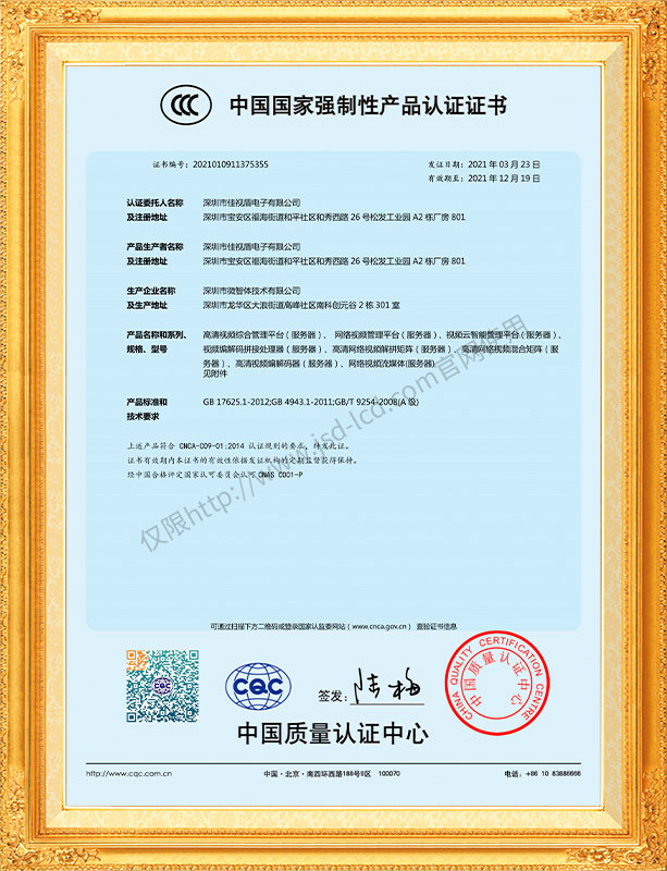 佳視盾科技采用了科學現代化管理模式,公司和產品通過了CCC、CB、CE、FCC、ROHS、ISO9001、職業健康管理體系、環境管理體系,中國節能認證、多項認證,取得多項專利技術及多項軟件著作權, 并獲得國家及行業協會的多項榮譽證書,所有產品均經過嚴格老化檢測及測試,達到行業優等品的出貨標準。